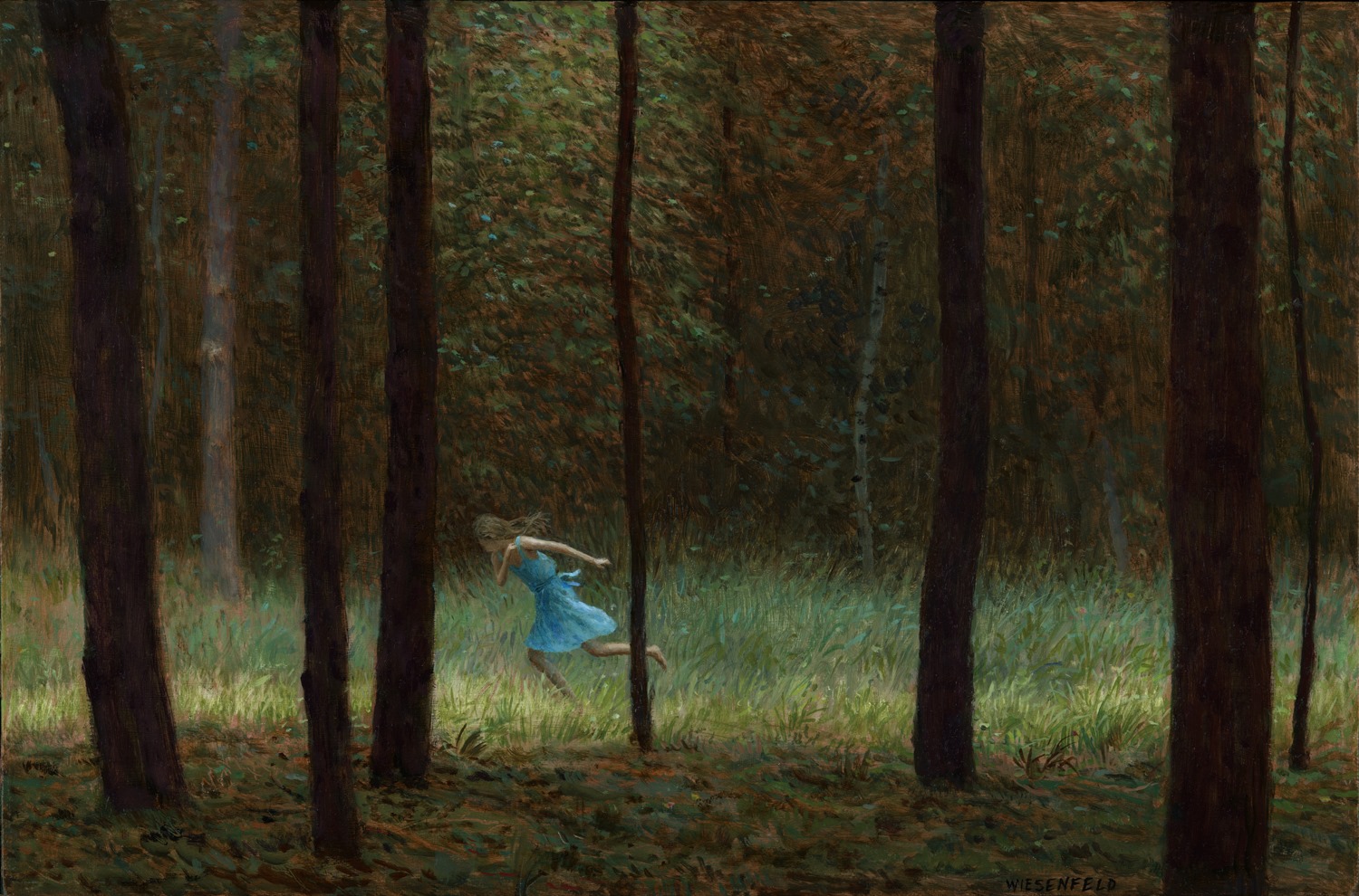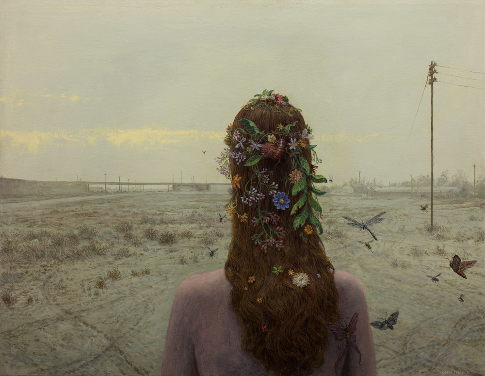 Aron Wiesenfeld to amerykański artysta, na którego prace trafiłam zupełnym przypadkiem, ale zauroczyły mnie od pierwszego spojrzenia. Wielka tajemnica i niezgłębiona melancholia osnuwają delikatnie każdy z jego obrazów, czyniąc je w dziwny sposób niepokojąco pięknymi. Sylwetki dzieci umieszczane na tle bezludnych przestrzeni są dla mnie symbolem uciekającego dzieciństwa i odejścia od niewinności. Świat, który tworzy artysta jest światem pełnym niezgodności, gdzie zimą jeździ się rowerem i nosi krótkie spodenki, życie kontrastuje ze śmiercią, a dorosłość miesza się z dzieciństwem. Te namalowane w charakterystycznym dla niego stylu dzieci wrzucone zostały na głęboką wodę, do świata niezależności i pozornej łatwości i z konsternacją próbują stawić czoła wyzwaniom dojrzałego świata, wciąż pozostając jednak w środku zwykłymi dziećmi. Jak my wszyscy.